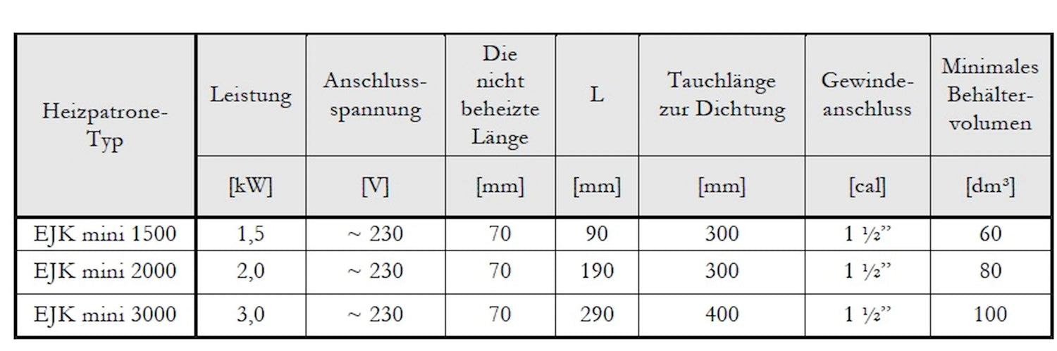 Нагревателният елемент има връзка с 1 1/2" Външна резба (AG) и пасва на стандартни резервоари за битова гореща вода и питейна вода. Благодарение на компактната си монтажна дължина от 300 мм и неотопляема дължина от 70 мм, нагревателният патрон може да се интегрира бързо и лесно. Включеният 1,5-метров свързващ кабел с щепсел Schuko гарантира лесно и директно захранване.
