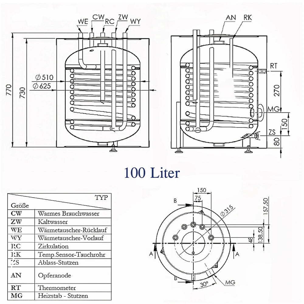 Volumen: 100 liter; Varmeveksleroverflade: 1,2 m²; Varmevekslerkapacitet: 5,27 liter. Tilslutningerne for fremløb, returløb og cirkulation er hver 3/4" AG, suppleret med en 1 1/4" IG-tilslutning til magnesiumanoden og en 1 1/2" IG-tilslutning til el-varmeelement.