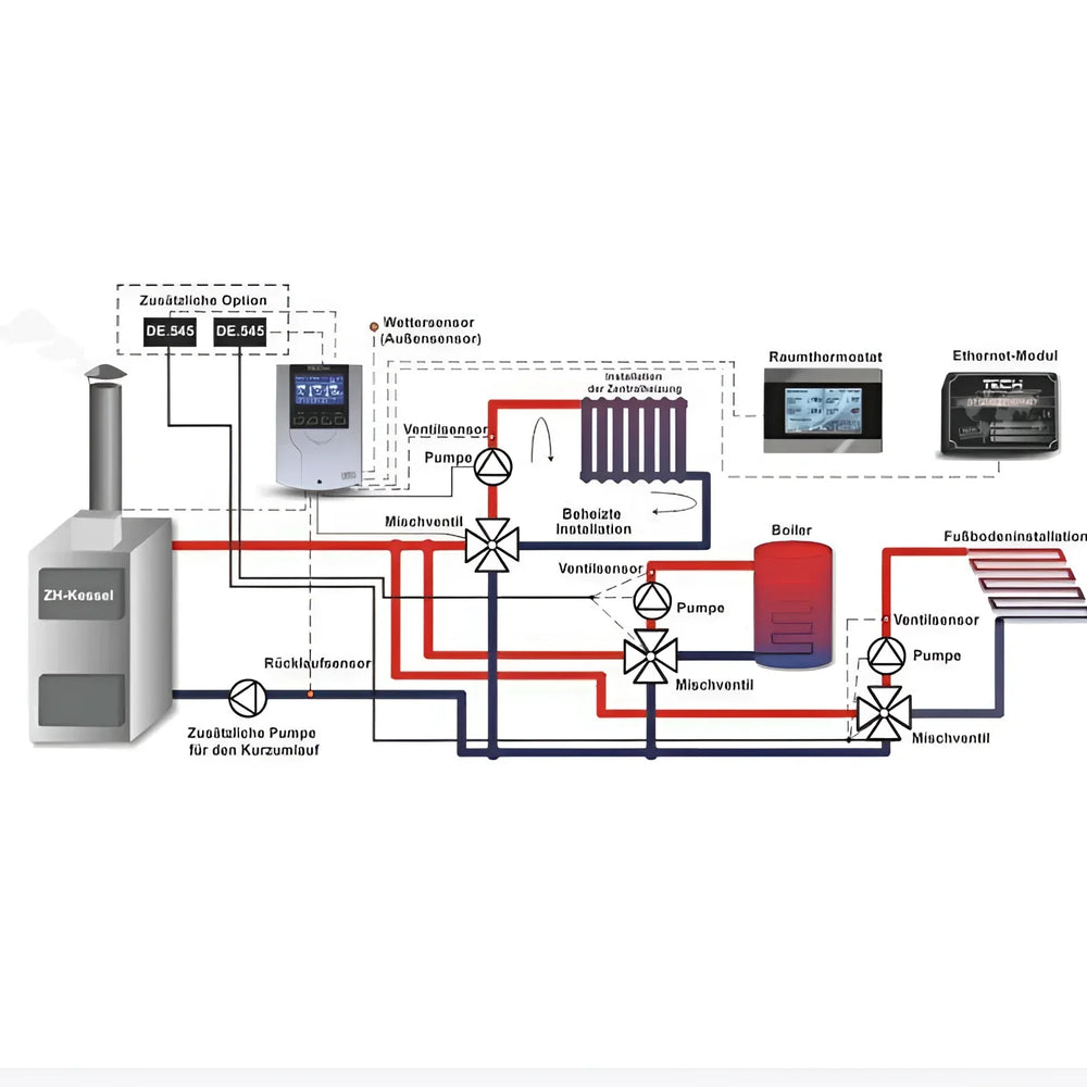 The weather-compensated heating circuit controller TECH i-1 CWU (EU-i-1 DHW) It controls a 3/4-way mixing valve including a valve pump and an additional hot water pump. Via an outdoor sensor (weather compensation), weekly program, and room thermostat connection, it maintains a stable flow temperature and enables... Backflow protection On the boiler. Ideal for modernization and new construction – for private homeowners as well as for installers.
