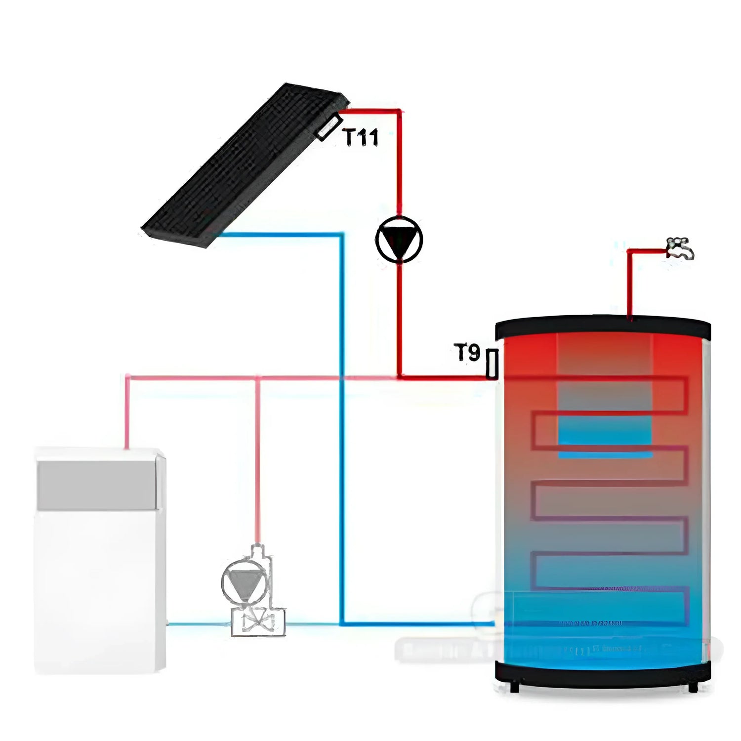 El sistema de control permite el control inteligente de la bomba de carga mediante la monitorización continua de los sensores de temperatura. En cuanto la fuente de calor alcanza una temperatura superior a la del tanque de almacenamiento, la bomba arranca automáticamente. Cuando la temperatura baja, la bomba se apaga para evitar horas de funcionamiento innecesarias. Esto mantiene el sistema eficiente y ahorra energía.
