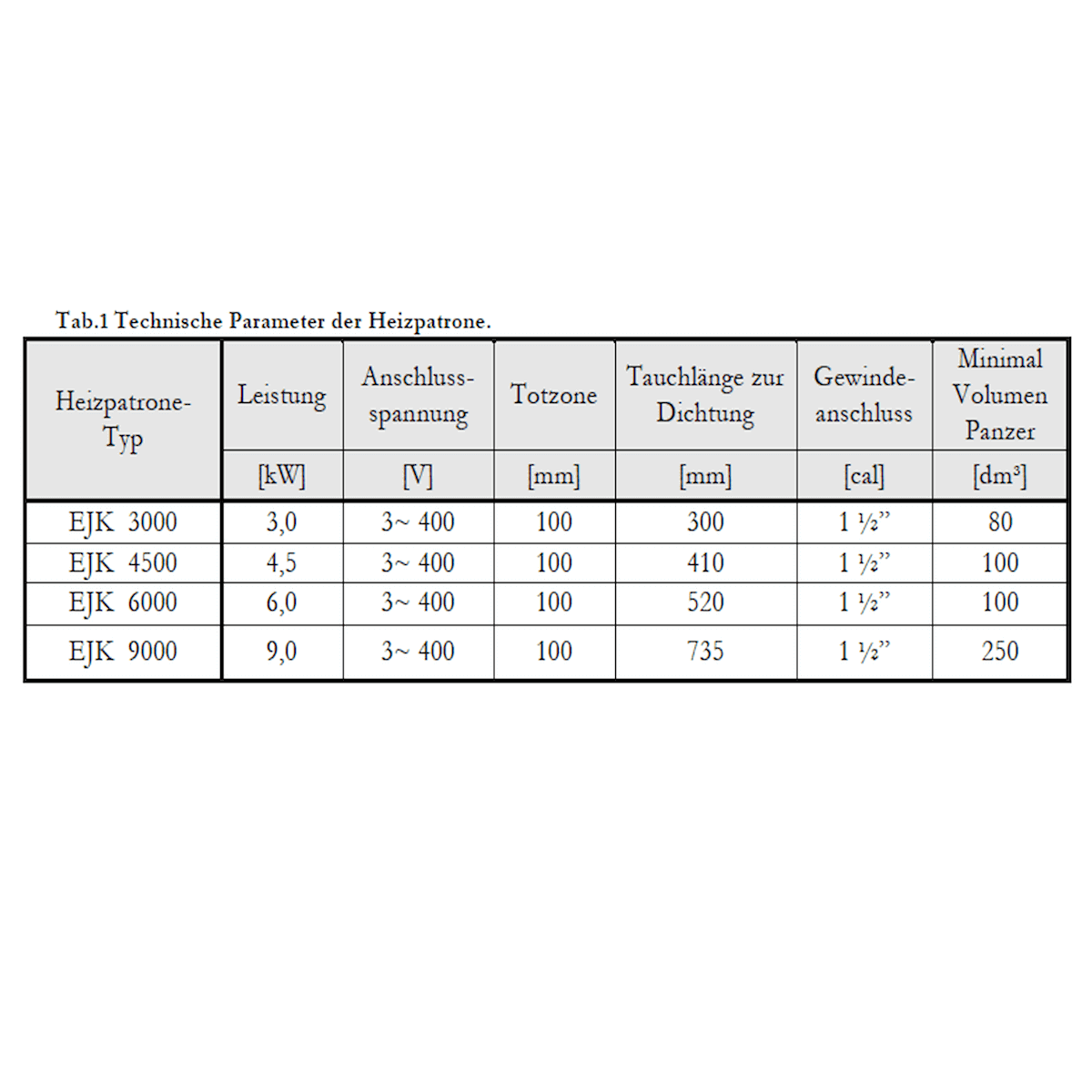 L'elemento riscaldante ha una connessione con 1 1/2" Filettatura esterna (AG) e si adatta ai normali serbatoi di acqua calda sanitaria e di acqua potabile. Grazie alla lunghezza di installazione compatta di 520 mm e alla lunghezza non riscaldata di 100 mm, la cartuccia riscaldante può essere integrata in modo rapido e semplice. Il cavo di collegamento da 1,5 metri incluso garantisce un'alimentazione elettrica semplice e diretta.