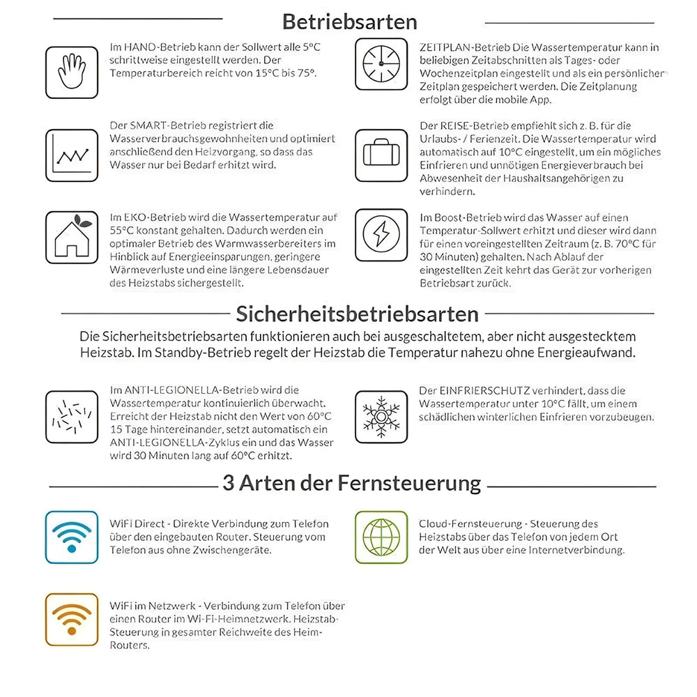 Altri punti salienti includono la testa isolata, una speciale protezione dalla corrosione e un design che tiene conto dell'aumento della tensione di rete, con conseguente lunga durata. controllo sono a tua disposizione: WiFi Direct consente una connessione diretta tra il telefono e l'elemento riscaldante, mentre il WiFi nella rete garantisce il controllo tramite il router di casa. Puoi anche azionare il dispositivo da qualsiasi parte del mondo utilizzando il telecomando cloud.